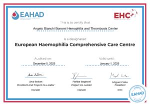 Il Centro Emofilia e Trombosi Angelo Bianchi Bonomi ha ricevuto il rinnovo dell’accreditamento di centro di cura completo di emofilia europea (EHCCC) da parte dell’Associazione Europea di Emofilia e Disordini Emorragici (EAHAD) e del Consorzio Europeo di Emofilia (EHC), a seguito dell’audit svolto nel 2025 sia sul posto sia on-line da parte di personale specializzato dell’ EAHAD stesso che ha condotto interviste e sopralluoghi con il coinvolgimento di tutte le figure professionali del Centro.